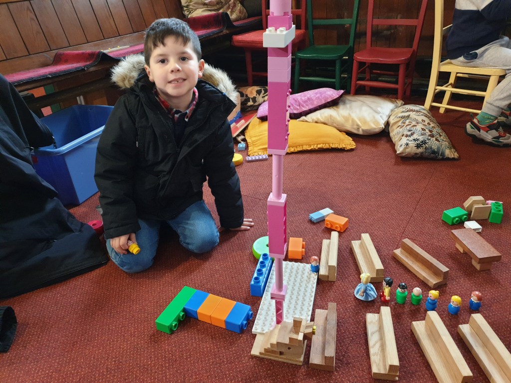 The photo below shows a child building his own church during the service.
