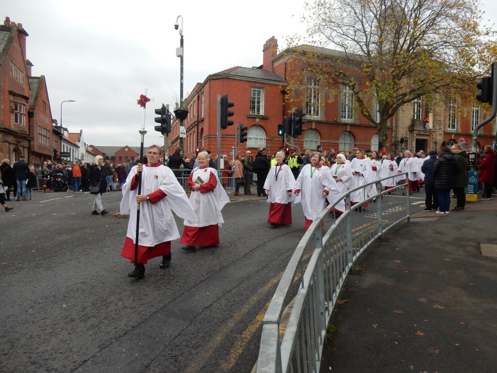 The Choirs of St Paul’s and St Joseph’s processed to the Cenotaph from the Church Hall and our Vicar Becky and Father Stephen presided over the service. Frank and Donald were also involved. The Slideshow below shows photos taken during the service.