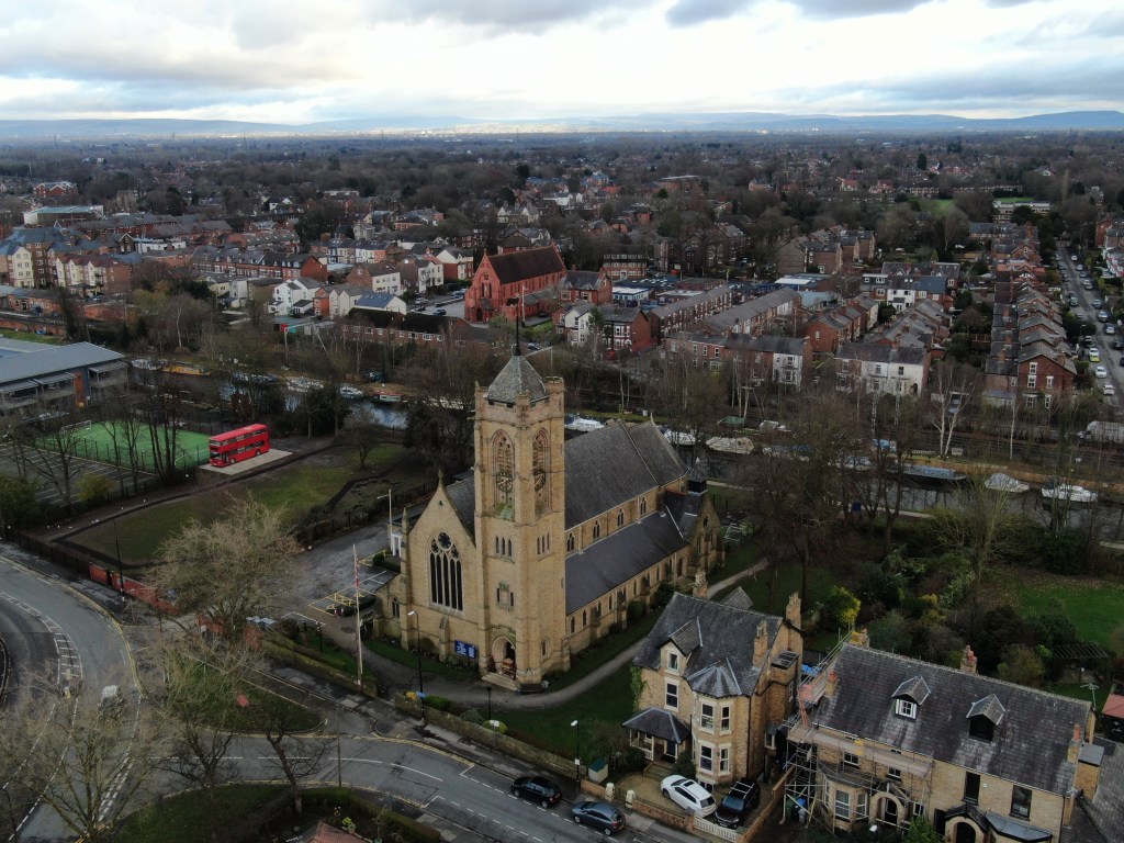 A recent aerial view of Sale, showing St. Paul’s Parish Church on Springfield Road and St. Joseph’s Catholic Church on Hope Road and the hills beyond.