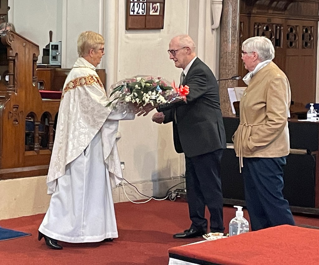 At the Sunday morning service, the last before the induction of our new vicar, a special thank you was made to Revd. Dr. Margaret Jones who has been conducting many services for us at St Paul’s during the vacancy. The photo shows Margaret receiving a bouquet of flowers from Harry and Jean.
