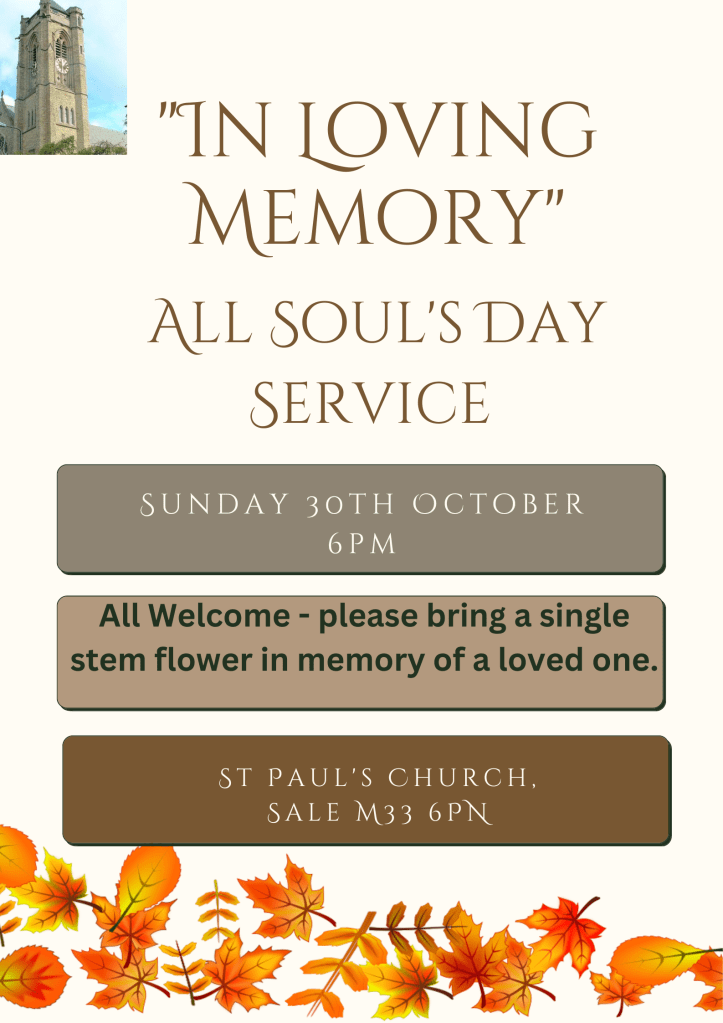 “In loving memory” All Souls Day Service October 20, 2022 Share this: Click to share on X (Opens in new window) X Click to share on Facebook (Opens in new window) Facebook Click to email a link to a friend (Opens in new window) Email Click to share on Pinterest (Opens in new window) Pinterest Click to print (Opens in new window) Print