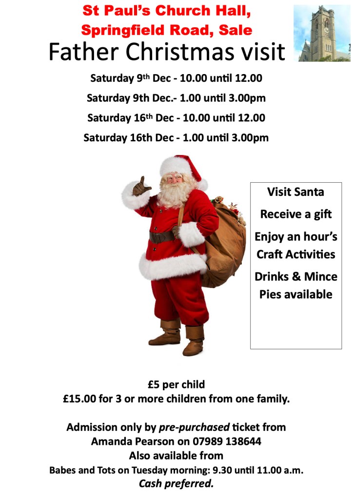 Once more we are holding our pre-Christmas event when Father Christmas will be visiting the Church Hall on Dec 9th and 16th. Details are shown below.