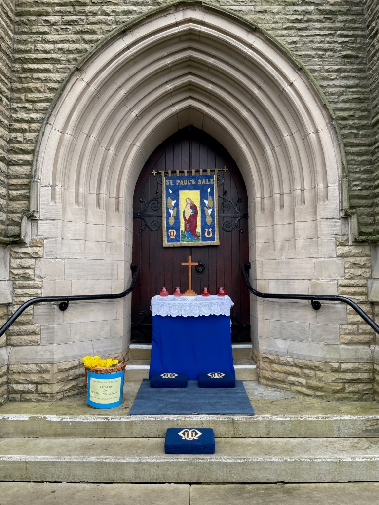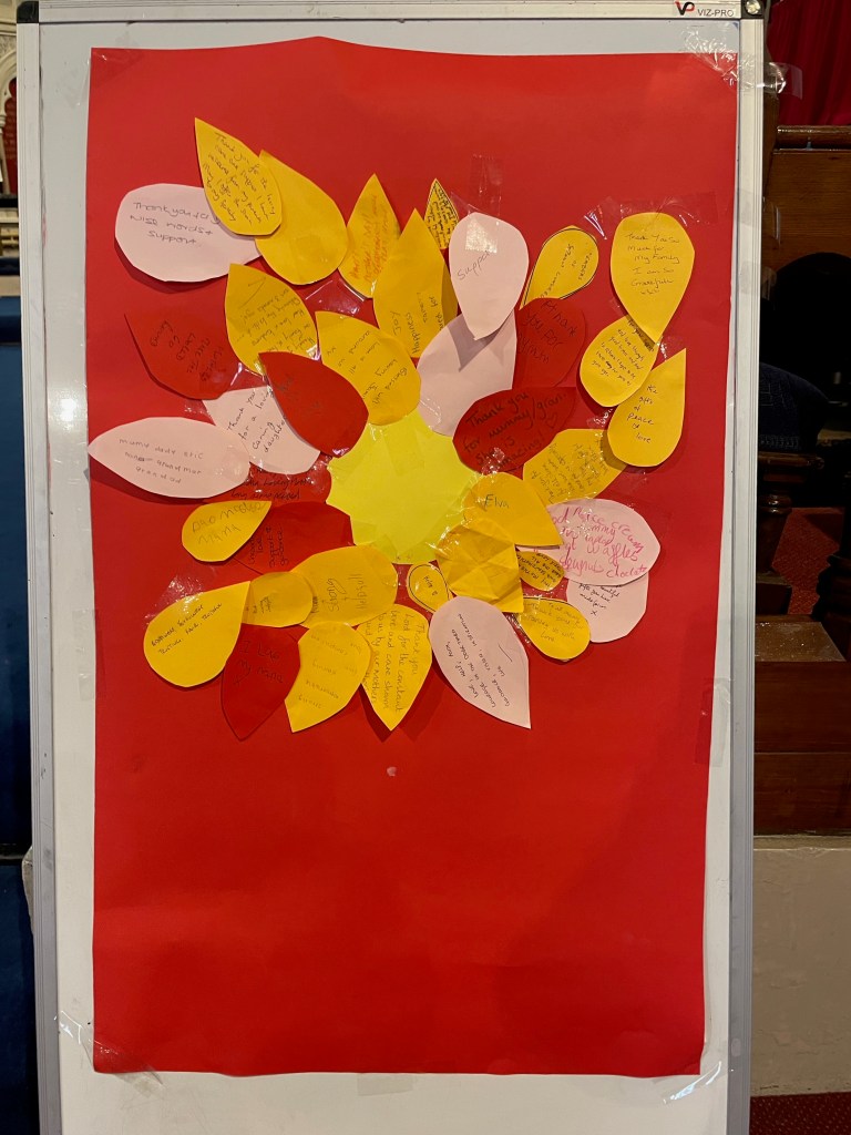 At the All Age worship on Mothering Sunday we were joined by the local Guides, Brownies and Rainbows and during the service the congregation were encouraged to write messages on a petal which were added to a flower on a sheet and the result is shown in the photo below. Bunches of daffodils and cards were given out during and after the service. A display in the Church porch included bunches of daffodils to be taken by passers by as shown in the photo below.
