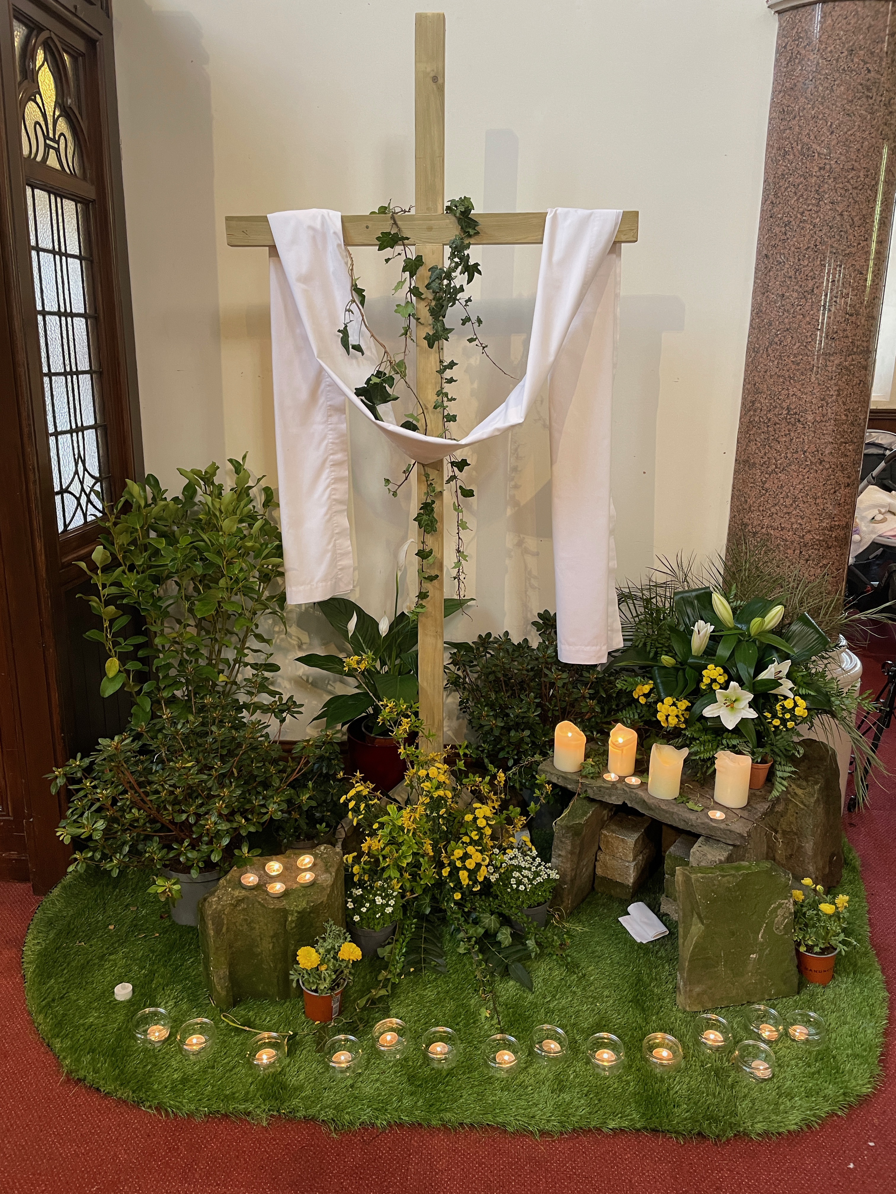 The photos below were taken on the day and during the following week when the Easter Cross was hung outside the Church – although it suffered some wind damage.