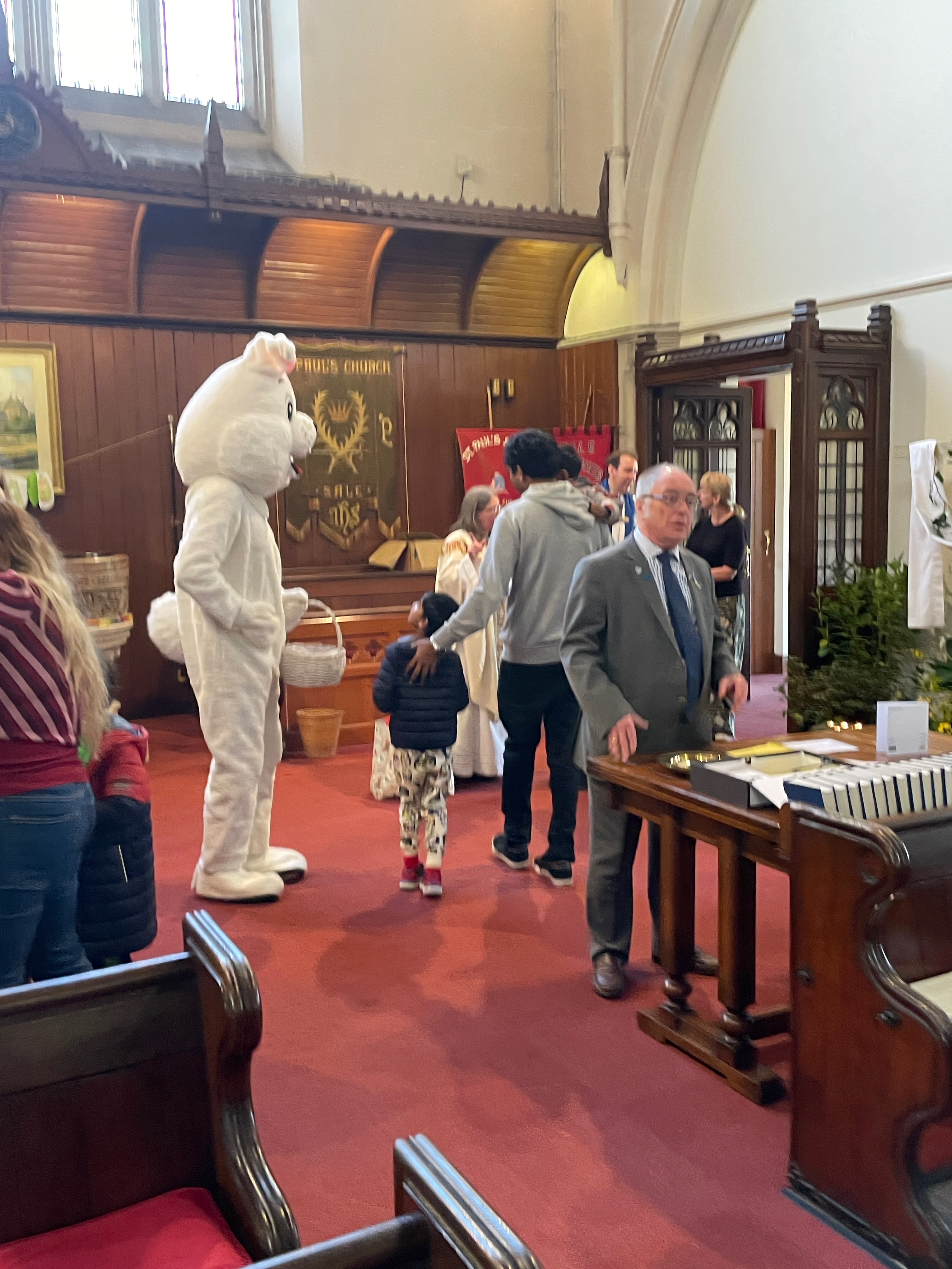 During the Easter Sunday service the congregation were invited to add flowers to the Easter cross and to wave to Frank and viewers in India who were watching the live stream. After the service there was a visit from a familiar friend.