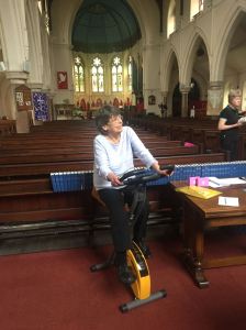 On Sunday June 28th there was a gift day to raise funds for the Church Hall Roof renewal. The highlight was a sponsored cycle ride to Blackpool by Rob & Paul and to match this two cycle machines in Church enabled others to ride to a virtual Blackpool. The photos here were taken during the event and on the photo with Sheila is Alan Buckley who was visiting from Australia. He was in St Paul’s choir 40 years ago.